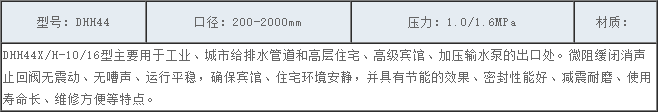 DHH44X/H-10/16型微阻缓闭消声止回阀主要用于工业、城市给排水管道和高层住宅、高级宾馆、加压输水泵的出口处。在设计上充分考虑了使用环境的要求,采用斜板式结构,达到无震动、无嘈声、运行平稳,确保宾馆、住宅环境安静,并具有节能的效果。用延缓关闭的方式使局部倒流水向系统内泄流,从而大大降低了停泵倒流的水压冲力,消除了破坏性水锤峰值的产生,截流密封采用丁腈橡胶,密封性能好、减震耐磨、使用寿命长、维修方便等特点。