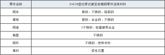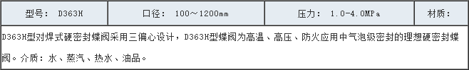 D363H型对焊式硬密封蝶阀被广泛用于介质温度≤425℃的治金 、电力、石油化工、以及给排水和市政建设等工业管道上。采用精密的J形弹性密封圈和三偏心多层次金属硬密封结构,作调节流量和载断流体使用,阀座与碟板密封面均采用不同硬度和不锈钢制作,具有良好的耐腐蚀性,使用寿命长,本阀具有双向密封功能,产品符合国家GB/T13927-92阀门压力试验标准。